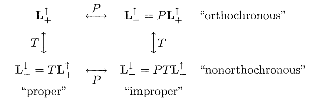 连续洛伦兹变换实际对应 正规正时洛伦兹群 proper, orthochronous Lorentz group L+↑。宇称变换与时间反演将洛伦兹群的四个不连通的子群联系起来。
